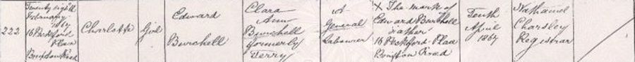 | 28 Feb 1867 | Birth of 9©Charlotte BURCHELL, d/o Edward (General Labourer) & Clara (?Mary) Ann (nee TERRY), 6 Peckford Place, Brixton? Road | Jun 1867 Lambeth 1d 423 |