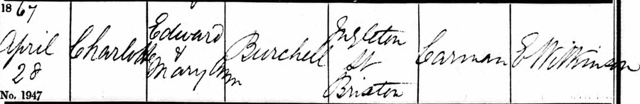 | 28 Apr 1867 | Christening of 9©Charlotte BURCHELL d/o Edward (Carman) & Mary Ann of Ingleton Street, Brixton, St Michael, Stockwell, Surrey | IGI: 100305951434 | |