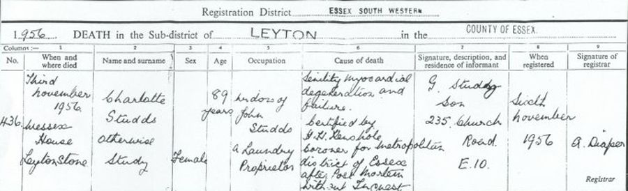 | 3 Nov 1956 | Death of Charlotte Mabel STUDDS (nee BURCHELL) (89) | Original Certificate | |