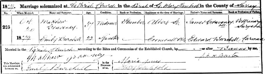 | 20 Oct 1879 | Marriage of Matthew GRAVENEY (Widr 37 Plumber) s/o James