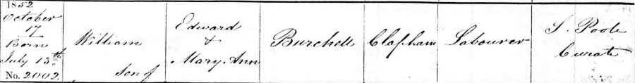 | 17 Oct 1852 | Christening of 4©William BURCHELL, Holy Trinity, Clapham, Surrey | IGI: 500152217322 & LMA | |