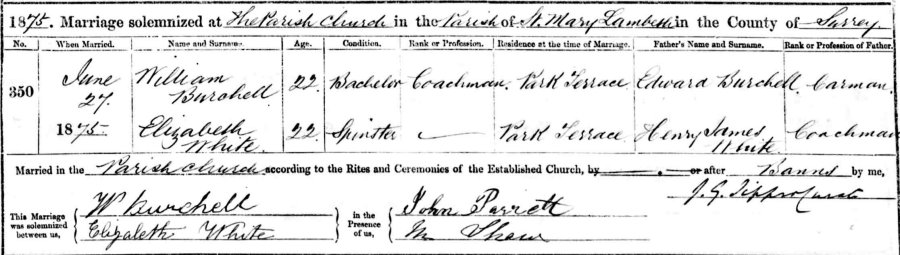 | 27 Jun 1875 | Marriage of 4©William BURCHELL (22 Coachman) s/o Edward